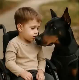 On a calm afternoon in a small village, a young boy sat in his wheelchair near the garden. Paralysis kept him from moving freely, but he felt safe with his loyal Doberman by his side. The dog seemed to sense the boy’s needs before anyone else could.