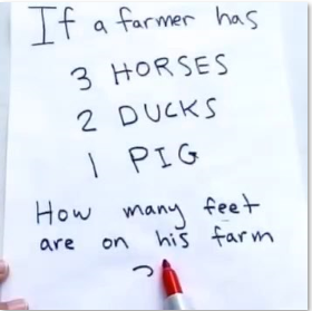 “If a farmer has 3 horses, 2 ducks, and 1 pig, how many feet are on his farm?”