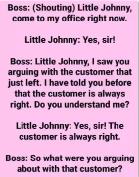 Puzzled, the boss asked, “Then why were you arguing with that customer?” Johnny answered sincerely, “Because he kept saying I was right, and