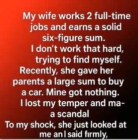 My wife works two full-time jobs and earns a solid six-figure income. I don’t work that hard—mostly searching for myself. Recently, she gave her parents a large sum to buy a car, while my parents received nothing. I lost my temper. I felt hurt and left out. I caused a scene.