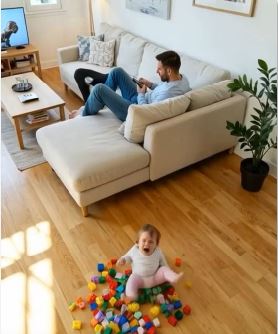 Emma cried in the living room. Her father sat nearby, scrolling his phone. Then he turned toward her. At first calm, his gestures soon became sharp. His expression hardened. He grabbed her toy and threw it aside.