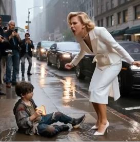 People turned. Phones rose. The billionaire known for her polished elegance was now berating a homeless child in the street. Her anger flared — she shoved him back. The boy stumbled, landing in a puddle.