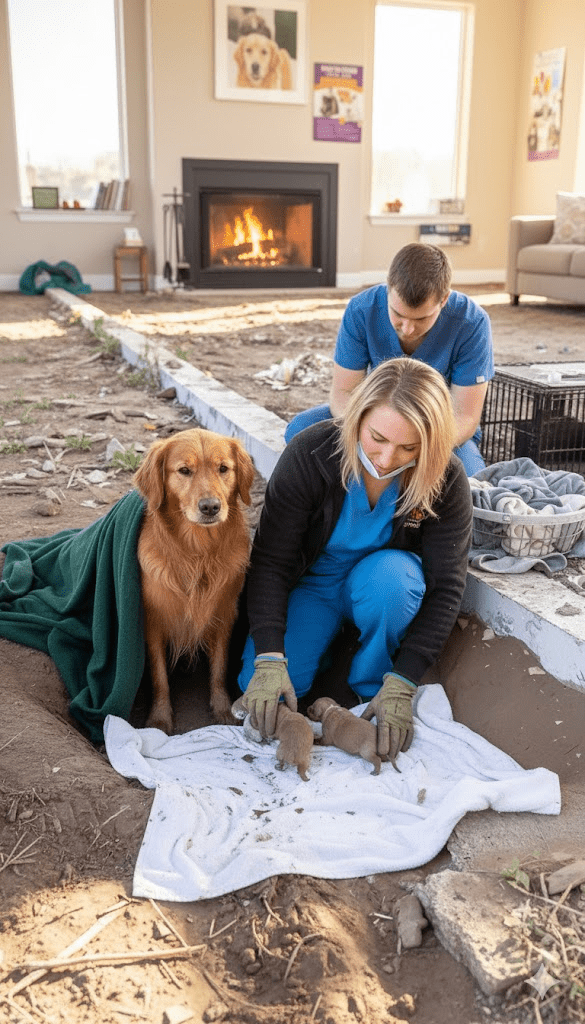 The rescue operation was a delicate balance of urgency and caution. Approaching a protective mother with her newborns, especially one in a vulnerable state, required a gentle touch and a patient demeanor. Rescuers, alerted to the dog’s plight, arrived at the scene with blankets, food, and a sense of profound empathy. The golden retriever, initially wary, slowly began to respond to their calm voices and reassuring presence. It was clear she was exhausted, hungry, and desperate for help, but her primal instinct to shield her pups remained strong. Carefully, and with utmost respect for her maternal bond, the team began the process of extricating her and her tiny family from the cold, wet mud. Each pup was gently lifted and wrapped in a warm blanket, their small bodies shivering from exposure. The mother watched intently, her gaze following each movement, a silent plea in her eyes for the safety of her offspring.