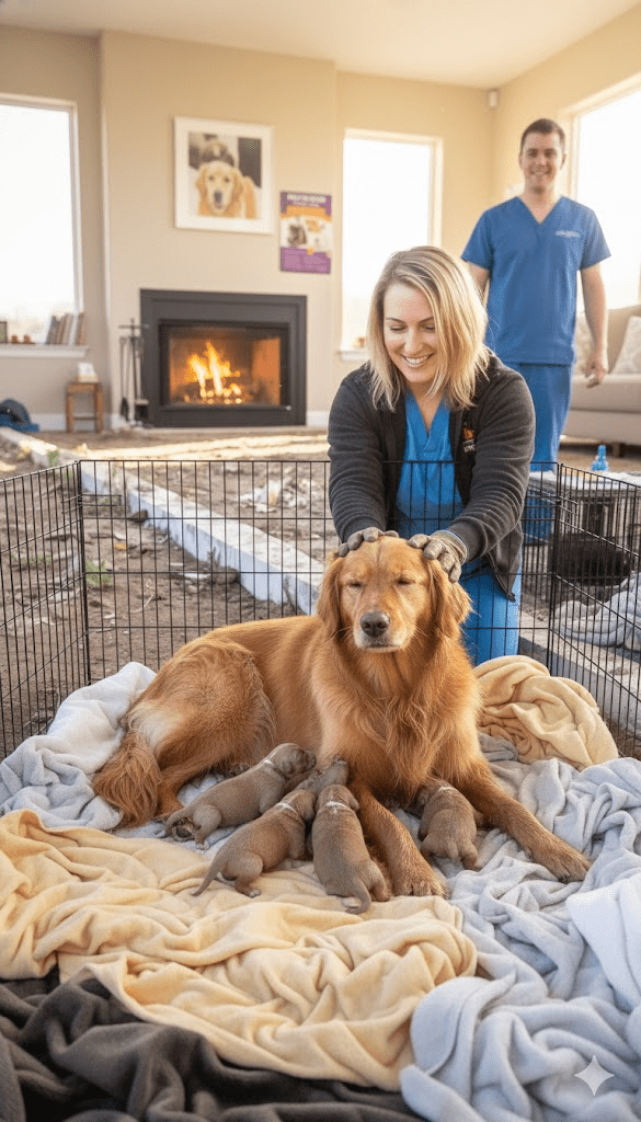 Once they were all safely out of the ditch, the immediate priority was warmth and nourishment. The golden retriever, whom rescuers affectionately named “Goldie,” was given a much-needed meal, which she devoured with a hunger that spoke volumes about her recent struggles. Her pups were carefully examined, their tiny bodies checked for any signs of distress or injury from their rough start in life. The rescue team provided a comfortable, clean space, ensuring Goldie could nurse her young in peace and security, a luxury she had clearly been denied for some time. The contrast between the cold, muddy ditch and the soft, warm bedding was stark, a tangible symbol of the hope now offered to this struggling family.