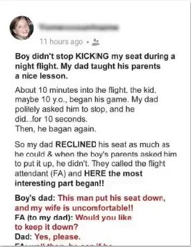 Without another word, he reclined his seat all the way back, right into the lap of the boy’s mother. Startled, she immediately called for a flight attendant, insisting my father was being “disrespectful.” The attendant checked, smiled politely, and replied, “Ma’am, he’s allowed to recline his seat.” My dad thanked her calmly and leaned back again. The woman said nothing more — and neither did the child behind me. The kicking stopped for good, replaced by the steady hum of the engines and a long-overdue peace.