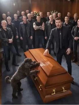 Behind me, Finn’s motorcycle club members stood stiff and unreadable. Leather jackets, stoic faces. Scrappy’s persistent paws stirred a flicker of fear in their eyes. Not sorrow. Fear.
