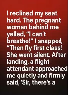 I once reclined my airplane seat without a second thought, eager to unwind after an exhausting week. Minutes later, the woman behind me — visibly pregnant — softly mentioned that my seat made it harder for her to breathe. Preoccupied and tired, I offered a polite nod but didn’t adjust. I told myself that comfort was a personal matter, something each passenger managed alone. She said nothing more, resting her hands protectively over her belly, and the rest of the flight passed in silence. Yet somewhere between the hum of the engines and the stillness of the cabin, I felt an unease I couldn’t shake.