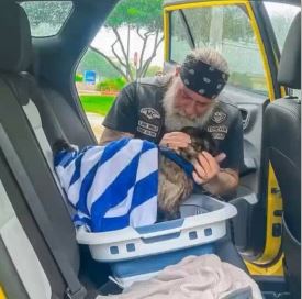 I pulled closer and realized what he held: a tiny German Shepherd puppy, injured and barely moving. His rough hands trembled as he whispered gentle words, the kind you’d say to a child having a nightmare.