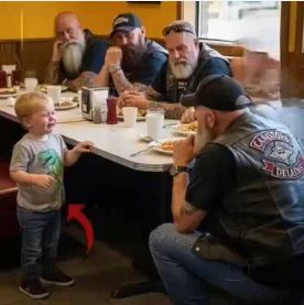 Big Mike, the leader of the group, gently knelt to meet his eyes. “Tell me what’s wrong, kid,” he asked softly. The boy, named Tyler, explained that his stepfather was hurting him and his mother. As he spoke, faint bruises peeked from beneath his collar — silent proof of his pain. Moments later, his mother emerged from the restroom, stopping short at the sight of her son surrounded by bikers. Her trembling hands and the fading marks on her face told the same story her son had just revealed. Big Mike offered her a seat, assuring her she was safe. For the first time in a long while, she believed him.