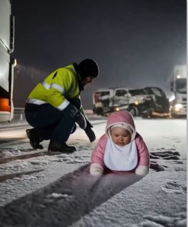 He jumped out, the cold wind stinging his face. There, in the center line, a baby crawled. No hat, no gloves, bare feet pressed to ice. Her white bib clung to a thin sleeper. Her cheeks were flushed from cold, her lips trembling, breath coming in soft clouds.